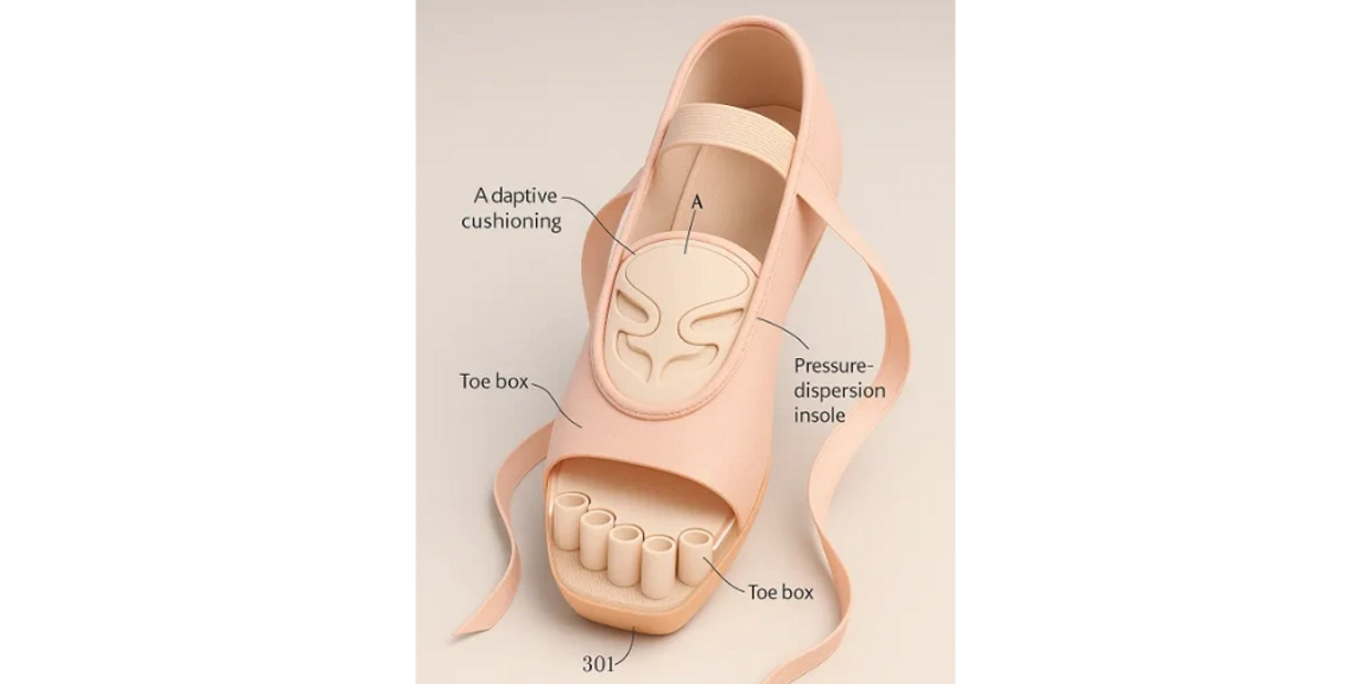 I designed and applied for a utility patent for a new type of ballet shoe after noticing how many dancers—myself included—struggle with toe pain and injuries. My design features a horizontal platform, five toe grooves, and a fluid cushion that adapts to movement, along with a small arch strap for added support. It spreads pressure, adds cushioning, improves stability, and helps prevent common pointe-shoe injuries.